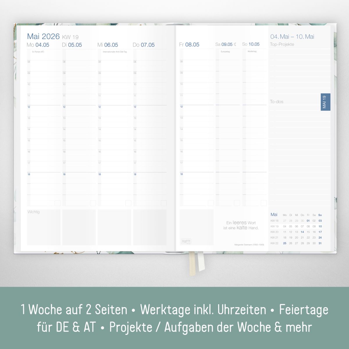 - BUSINESS-PLANER 2026 A5 – Kalender für 12 Monate mit 1 Woche auf 2 Seiten, Lesebändchen, Monatsvorschau für jeden Monat und einer großen Jahresübersicht zum Aufklappen. Die Laufzeit ist von Januar bis Dezember 2026.