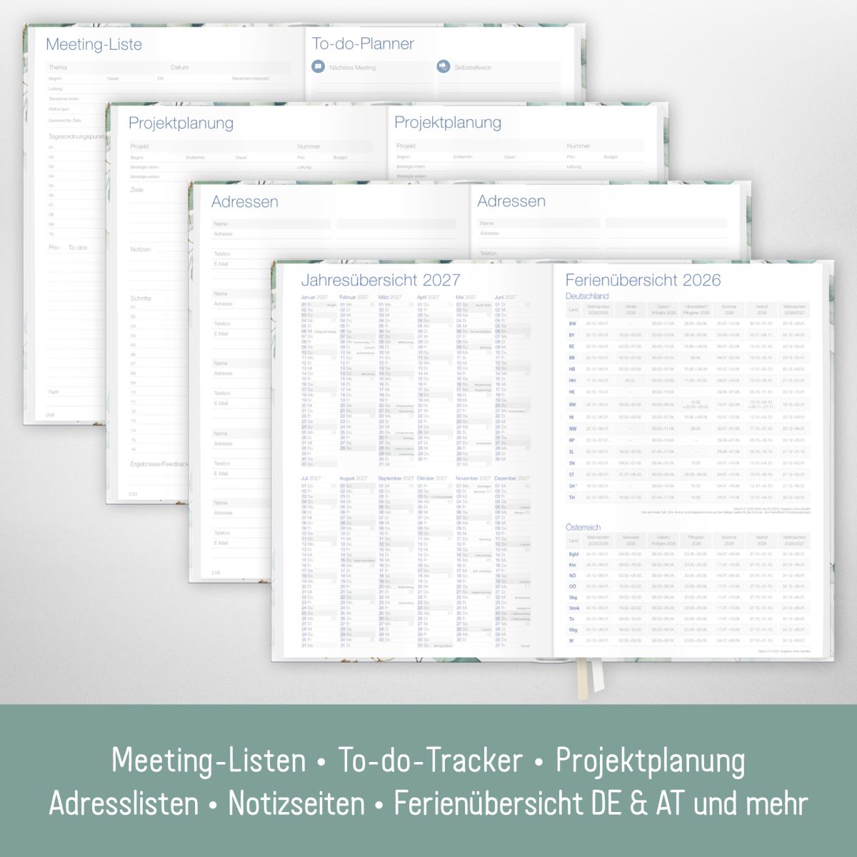 - DURCHDACHT & ÜBERSICHTLICH – Kalendarium mit Halb-Stunden-Takt, wöchentliche Top-Projekte und TO DOs, Projektplaner, Meeting-Listen, inspirierende Sprüche, Adress-Listen, Länderknigge, praktischer Fahrtkostenübersicht und mehr.