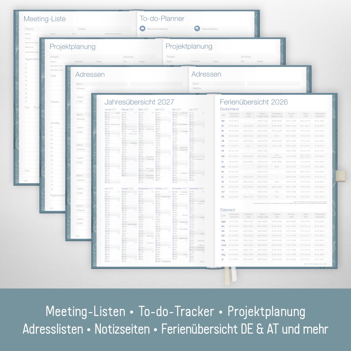 - DURCHDACHT & ÜBERSICHTLICH – Kalendarium mit Stunden- und Halbstundeneinteilung, wöchentliche Top-Projekte und To-dos, inspirierende Sprüche, Projektplaner, Meeting-Listen, To-do-Tracker, Adress-Listen, Urlaubstracker, Fahrtkostenübersicht und mehr.