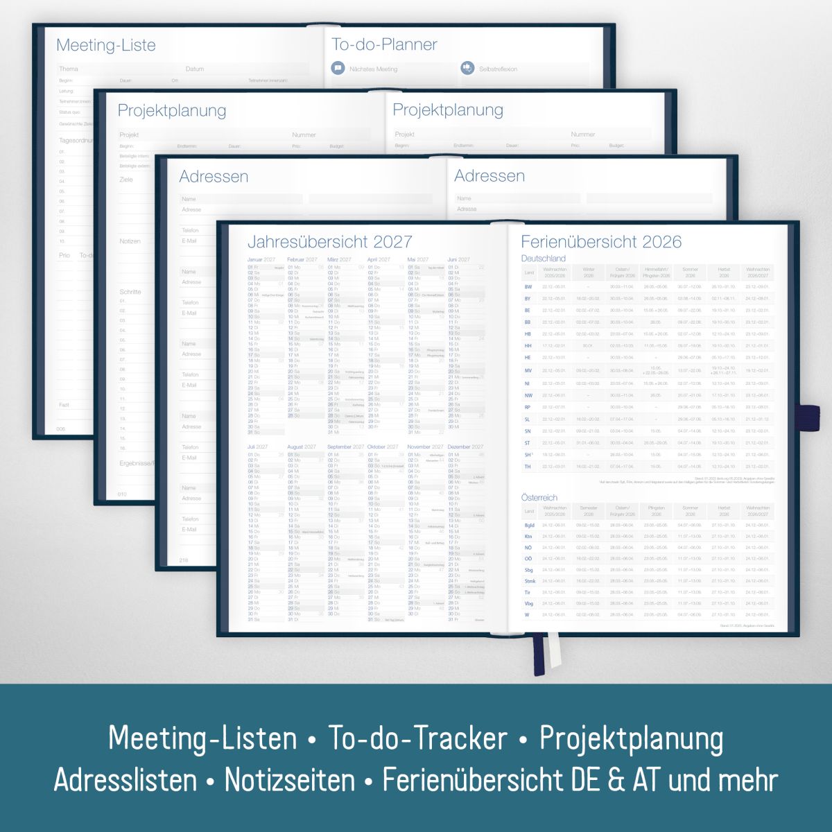 - DURCHDACHT & ÜBERSICHTLICH – Kalendarium mit Stunden- und Halbstundeneinteilung, wöchentliche Top-Projekte und To-dos, inspirierende Sprüche, Projektplaner, Meeting-Listen, To-do-Tracker, Adress-Listen, Urlaubstracker, Fahrtkostenübersicht und mehr.