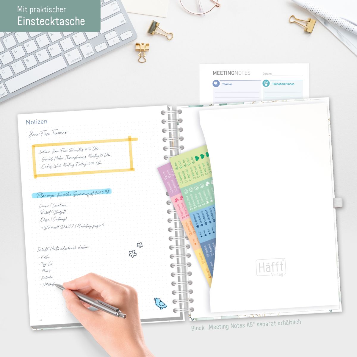 - DURCHDACHT & ÜBERSICHTLICH – Monatsvorschau für jeden Monat inkl. Habit-Tracker, Feiertage in DE | AT, Monats- und Jahresübersichten, Urlaubsplanung, Projektplaner, Meeting-Listen, Adresslisten und viel Platz für Notizen.