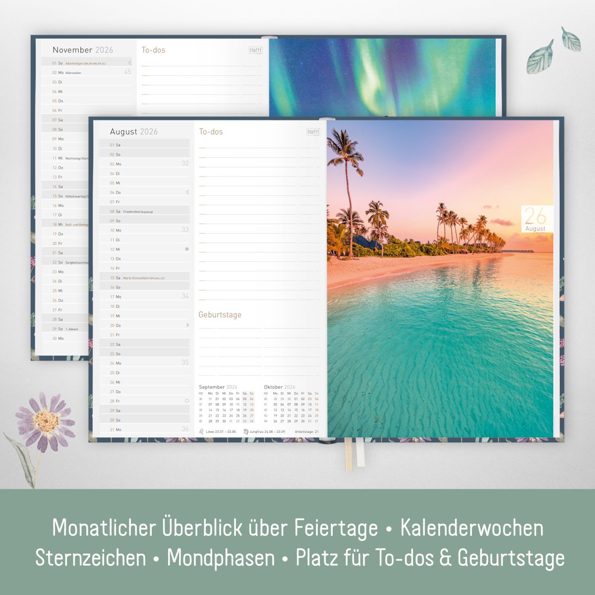 • INSPIRIEREND UND DURCHDACHT – Mit stimmungsvollen Bildern und hilfreichen Features wie Feiertage und Schulferien für DE und AT, Urlaubstracker, Monats- und Jahresübersichten, Mood-Tracker, Wochenplänen, Listen, Notizseiten und mehr.