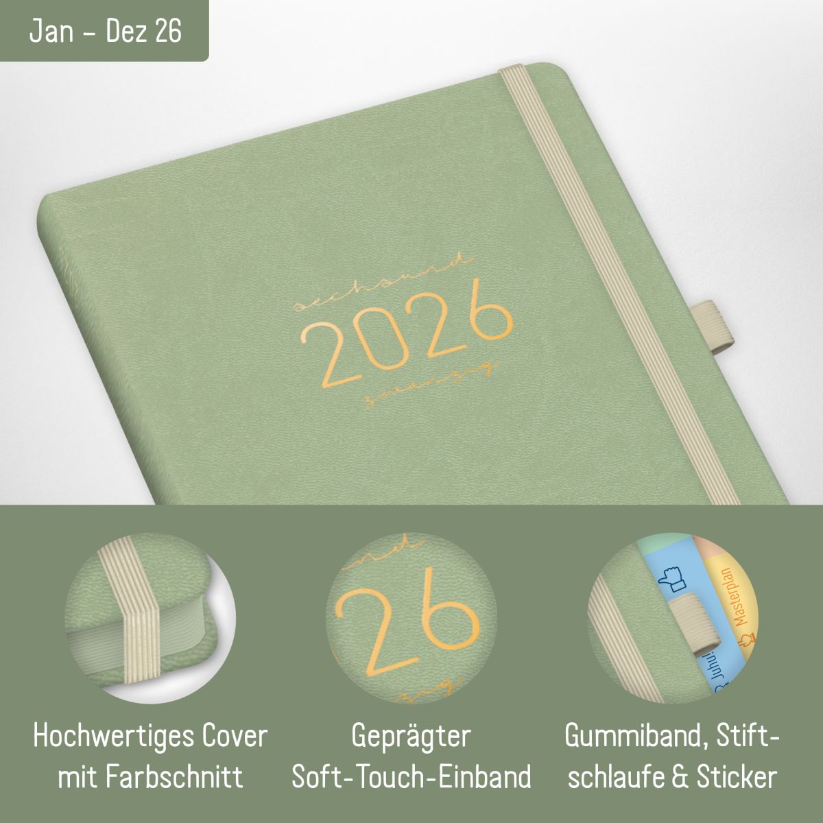 - DELUXE TERMINPLANER 2026 A5: Laufzeit von JANUAR bis DEZEMBER 2026: inkl. Stifthalter, Gummiband, Sticker, Einstecktasche für Zettel & Co, 2 Lesebändchen, veredeltem Seiten-Schnitt und außergewöhnlicher Soft-Touch-Haptik. JETZT NEU: Stärkeres 100g/m² Papier (statt 90g/m²)!