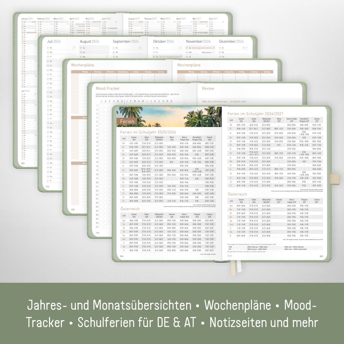 - ÜBERSICHTLICH UND DURCHDACHT – Organizer mit 1 Woche auf 2 Seiten, Monats- und Jahresübersichten, nützlichen Features wie Feiertagen und Schulferien für DE und AT, Urlaubstracker, Wochenplänen, Mood-Tracker, Listen, Notizen & mehr.