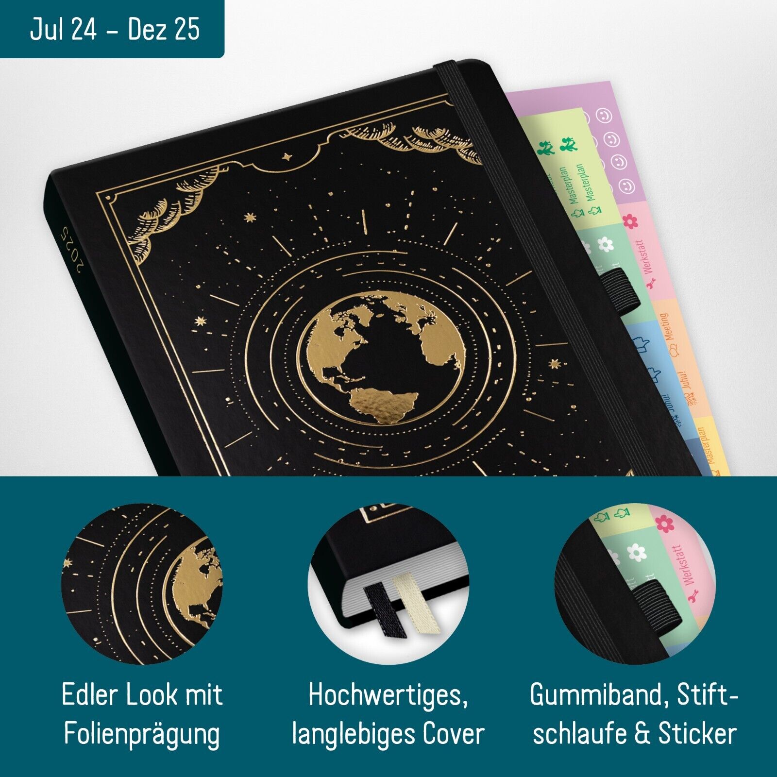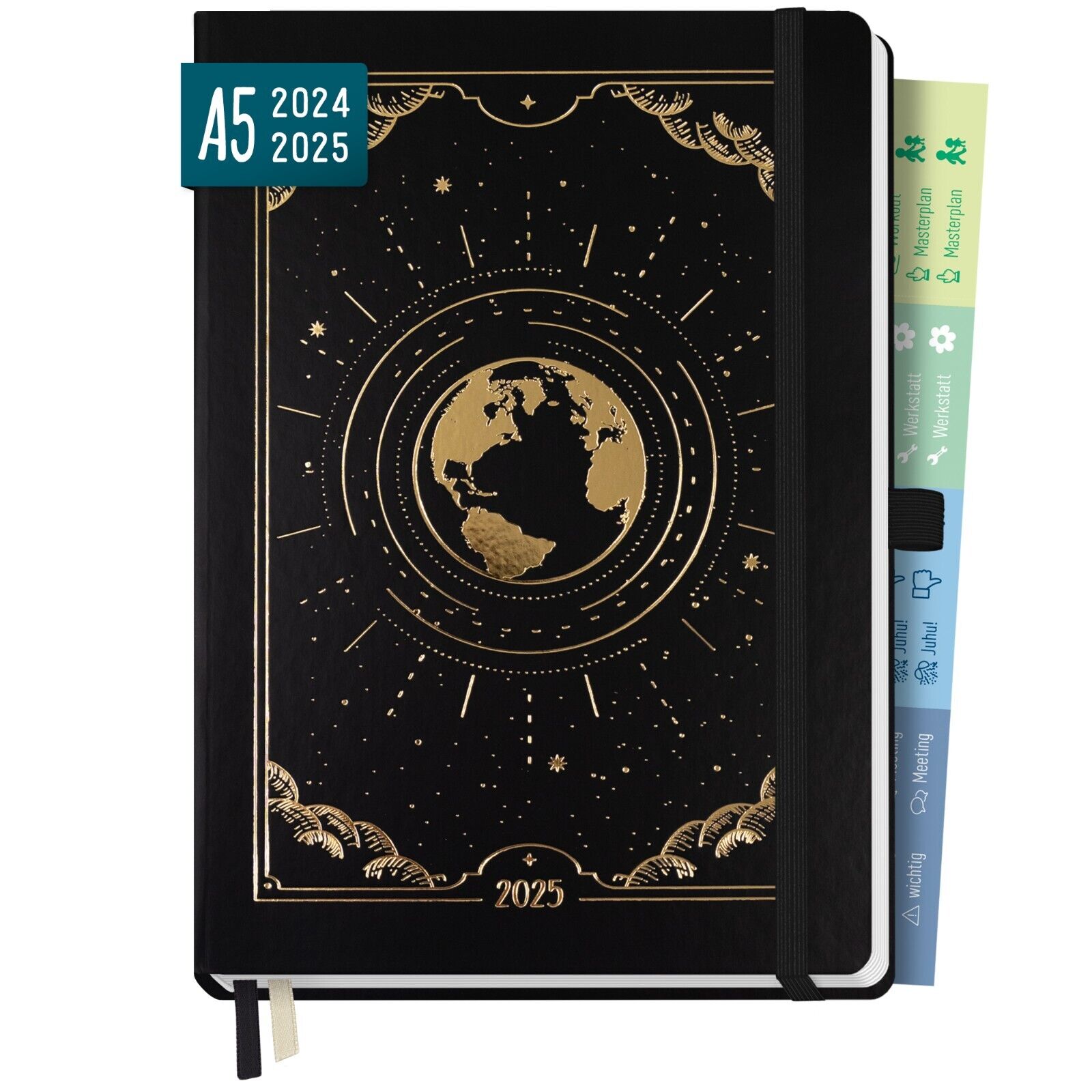 - PREMIUM TERMINPLANER 2024/2025 A5 – Laufzeit von JULI 2024 bis DEZEMBER 2025: mit edler Folienprägung, Gummiband, 2 Lesebändchen, Stiftschlaufe, Froschtasche zum Einstecken von Zetteln oder Belegen.