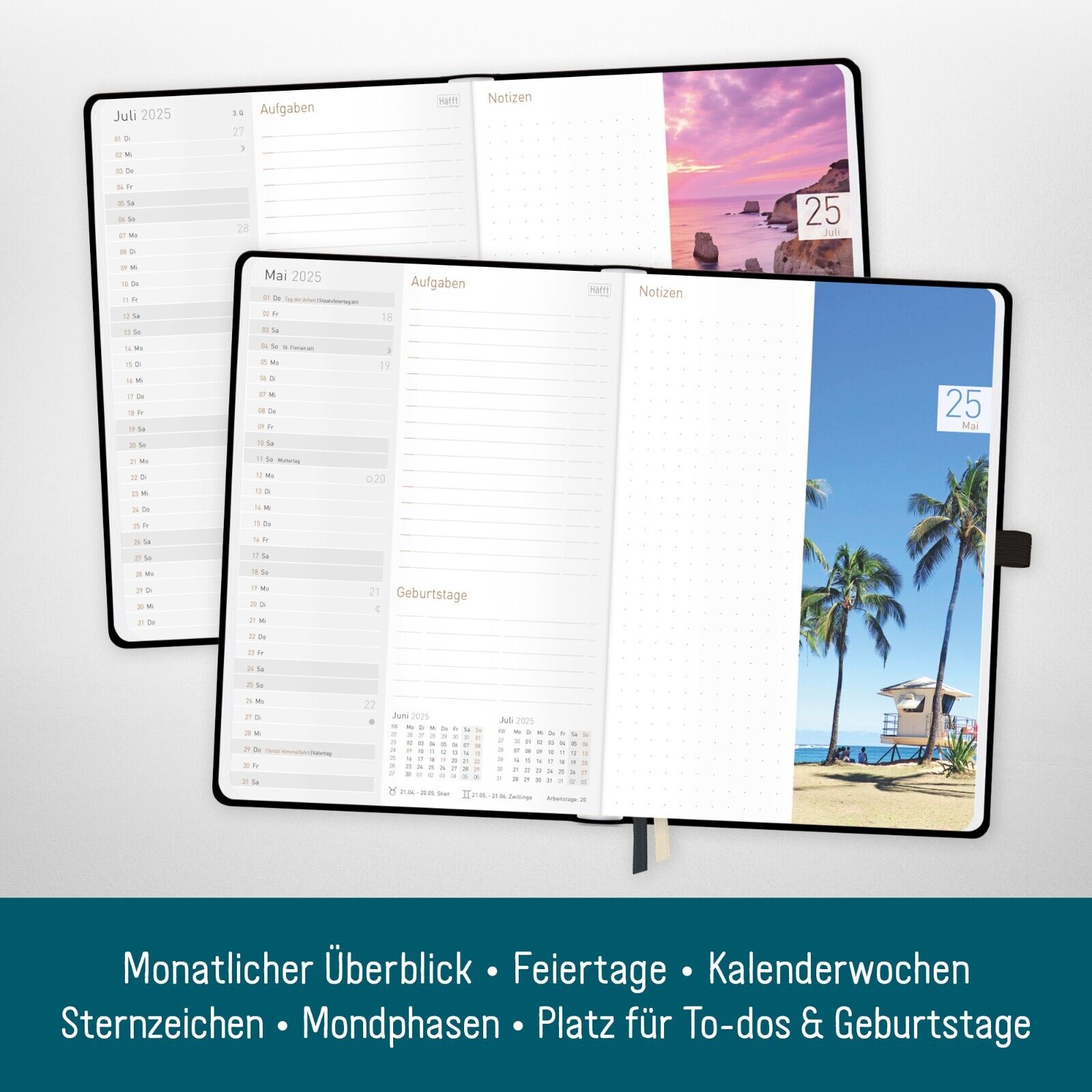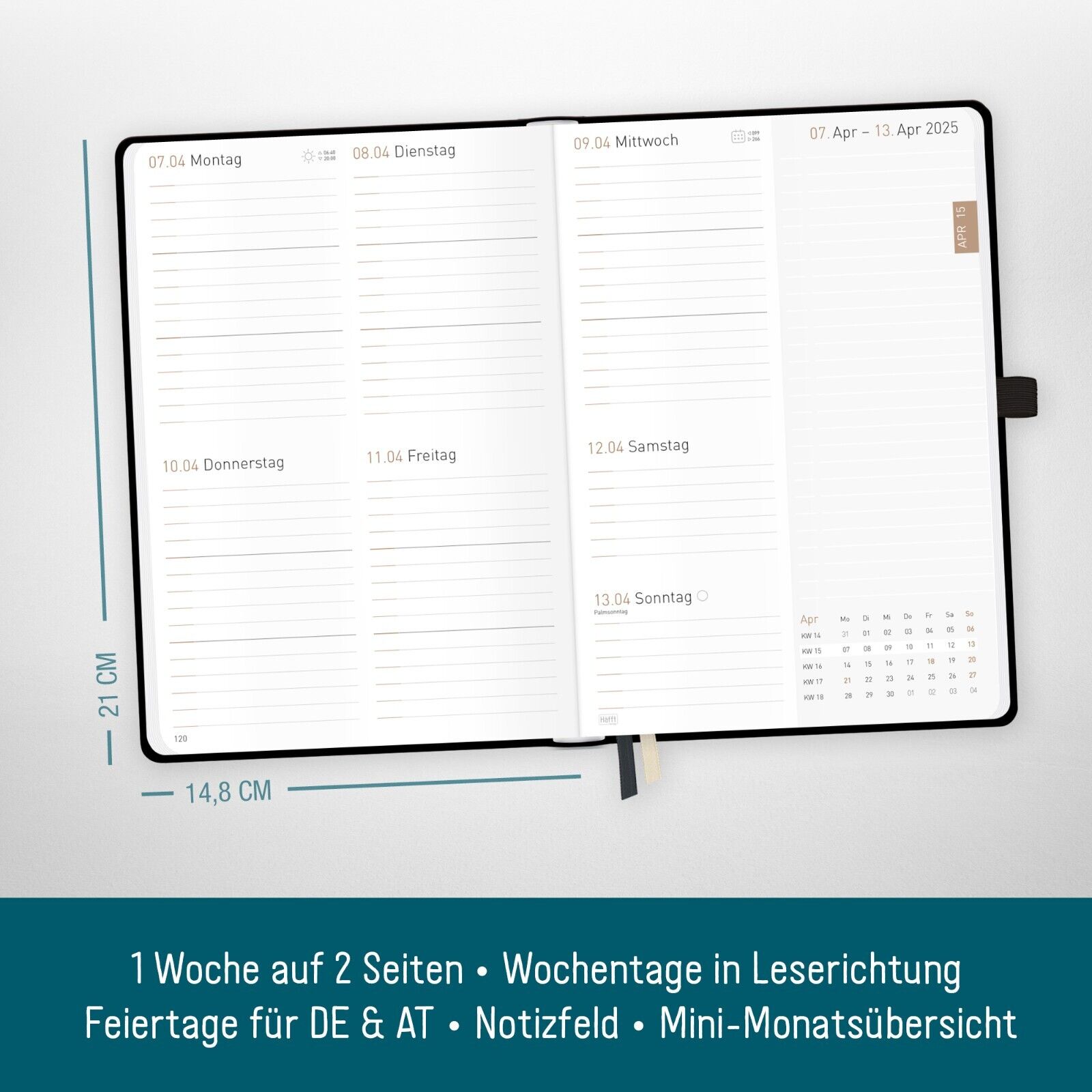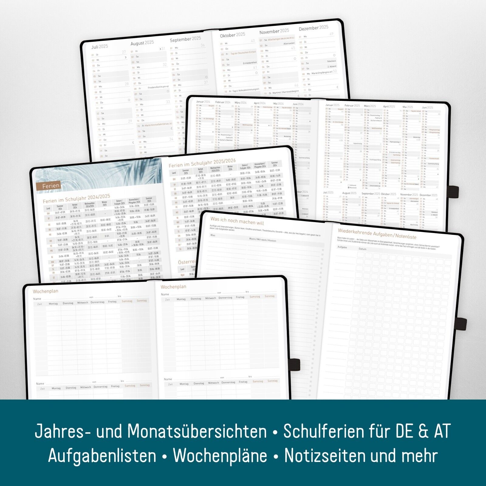 - ÜBERSICHTLICH UND DURCHDACHT – Organizer mit 1 Woche auf 2 Seiten, Monatsübersichten, nützliche Features wie Feiertage und Schulferien für DE und AT, Projekt- und Urlaubsplaner, Platz für Geburtstage, Adressen, Notizen.