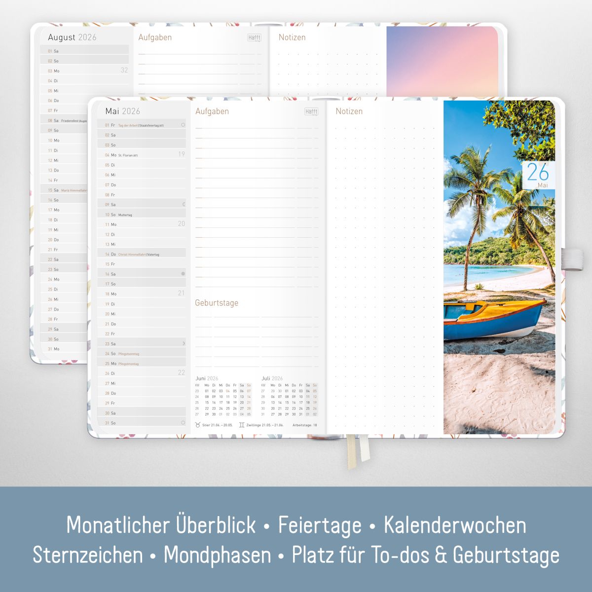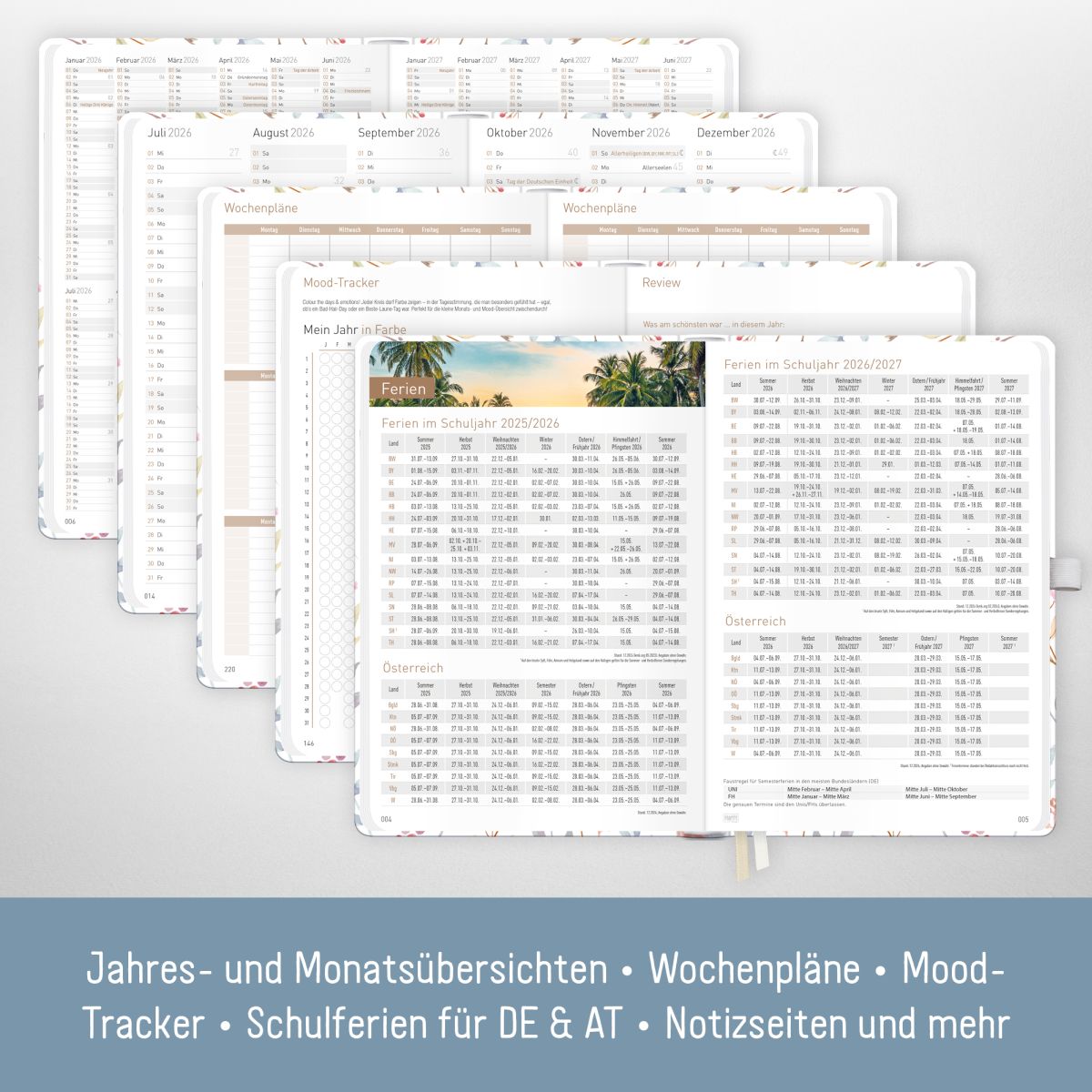 - ÜBERSICHTLICH UND DURCHDACHT – Organizer mit 1 Woche auf 2 Seiten, Monats- und Jahresübersicht, nützlichen Features wie Feiertagen und Schulferien für DE und AT, Urlaubsplaner, Wochenplänen, Mood-Tracker, Listen, Notizen & mehr.