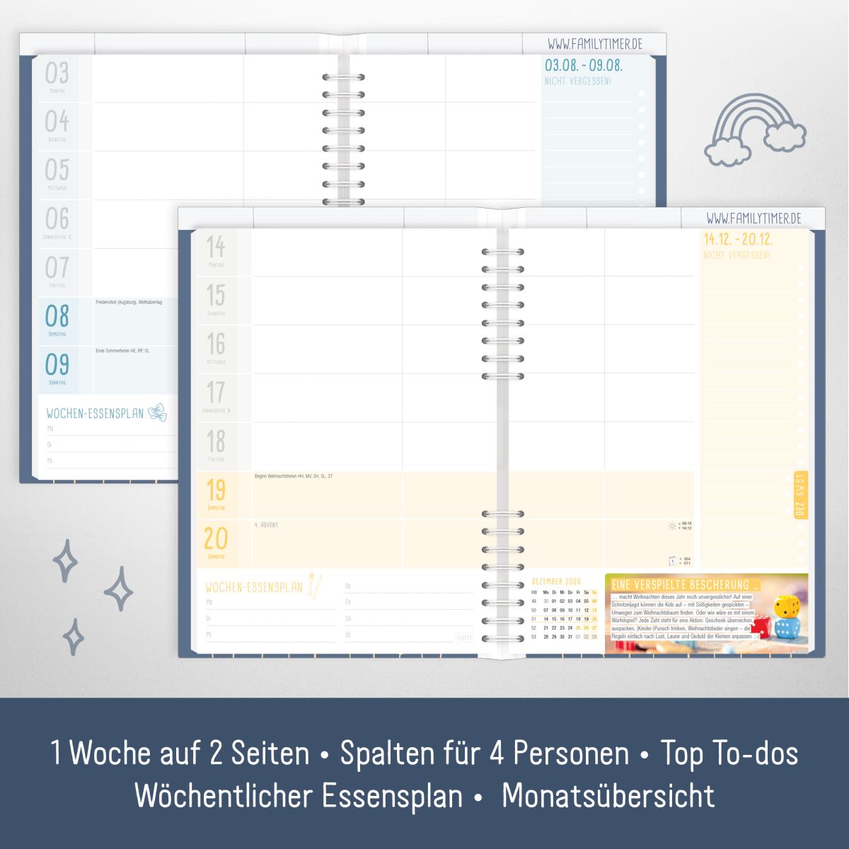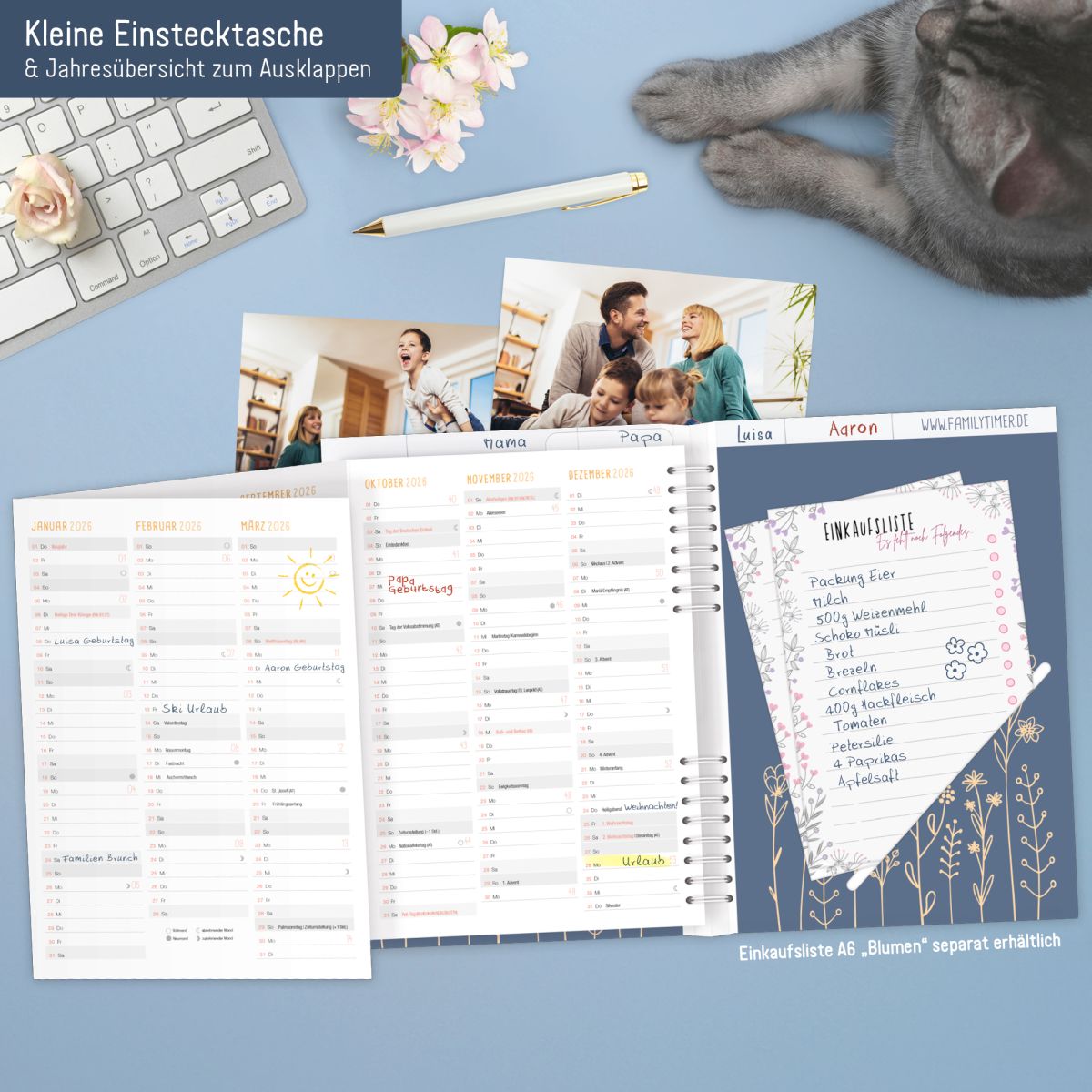 • WE ARE FAMILY – Übersichtlicher Familien-Wochenkalender 4-spaltig für bis zu vier Personen mit einer Laufzeit von Januar bis Dezember 2026. Mit extra Monatskalender zum Ausklappen, Lesezeichen zum Einklemmen, Gummiband zum Verschließen, Einstecktasche für Belege/Notizen.