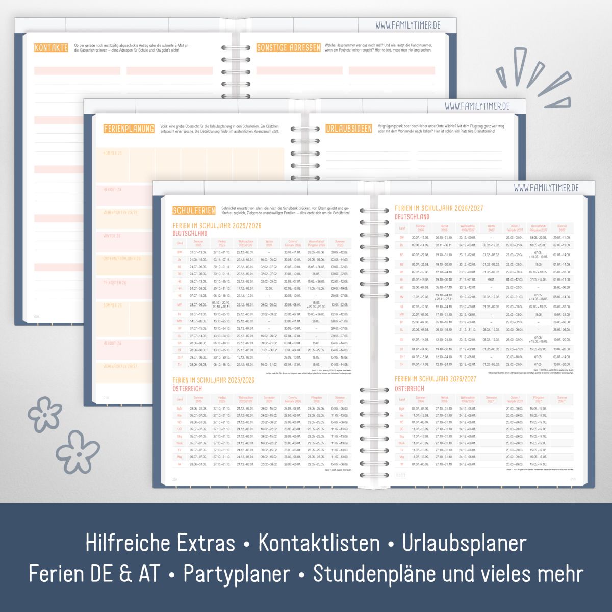 • IMMER ALLES IM BLICK – Wochenplaner für die ganze Familie mit allen Feiertagen & Schulferien für DE und AT, Urlaubsplaner, Notfall- und Service-Nummern, Impfübersicht, Jahres-Countdown, Adresslisten, Partyplaner, regionaler Obst- und Gemüsekalender und nützlichen Ideen und Wissen.