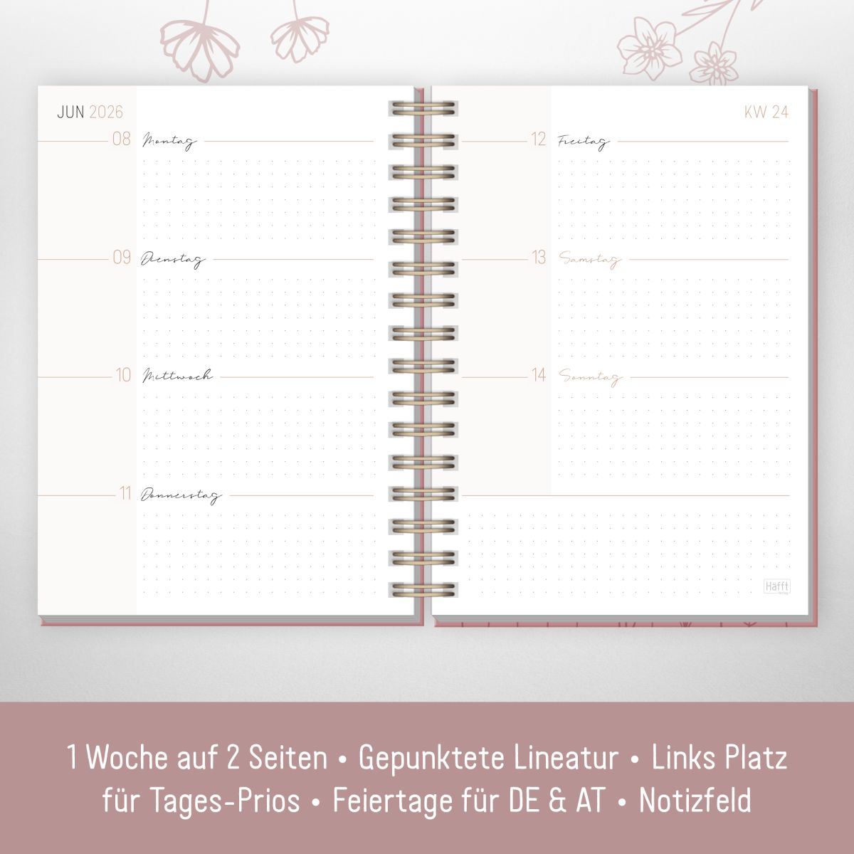 • SCHÖNES FÜR ALLE ZEITEN IN 2026 – 12 Monate mit doppelseitigem Wochenkalendarium von Jan 2026 – Dez 2026, zartes Design, jede Seite mit Dot-Lineatur für Notizen & Ideen jeder Art, farblich passende Metallspirale, glänzende Folienprägung & Gummiband.