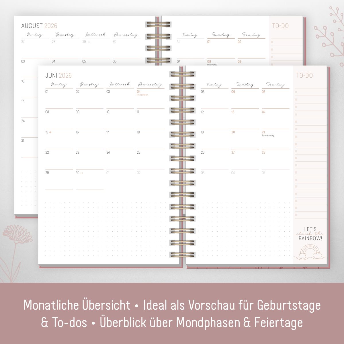 • MOTIVIERTE BESSERPLANUNG – Jeder Monatseinstieg mit Lettering-Spruch, strukturierter Tagesansicht und To-do-Liste, jede Woche mit viel Platz für Termine und Gedanken. Dazu: Feiertage & Ferien für DE & AT, Jahresübersicht 2026 + 2027, Wochenpläne & Projekt-Listen.