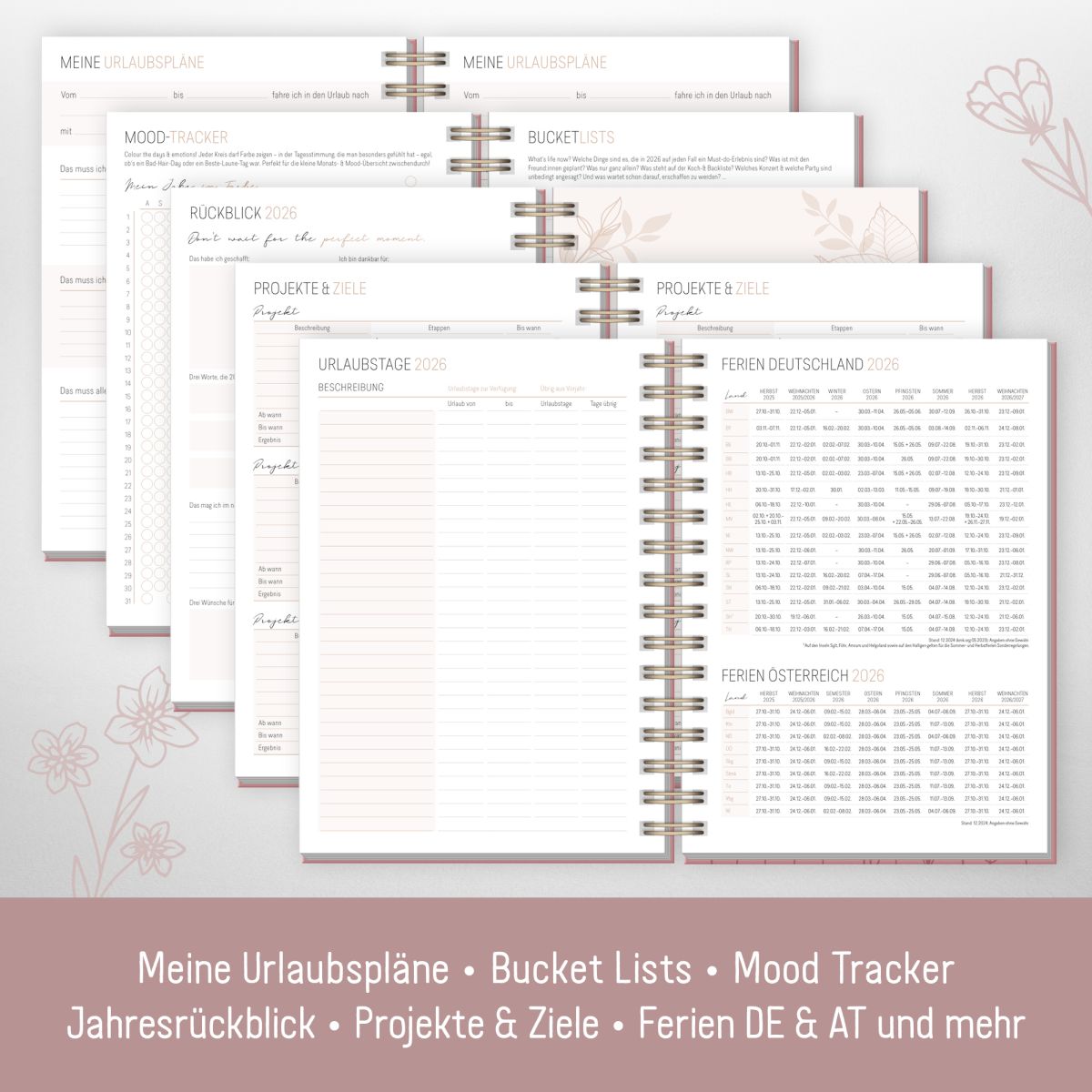 • EXTRA LIEBLINGSMOMENTE – Projekte und Persönliches im Herzensblick mit: Mood-Tracker, Bucketlist, persönlicher Rückschau auf 2026, Listen für Lebensziele, Kontakte & Urlaubspläne, Seiten für eigene Bilder & Erinnerungen zum Einkleben und dotted Notizseiten.