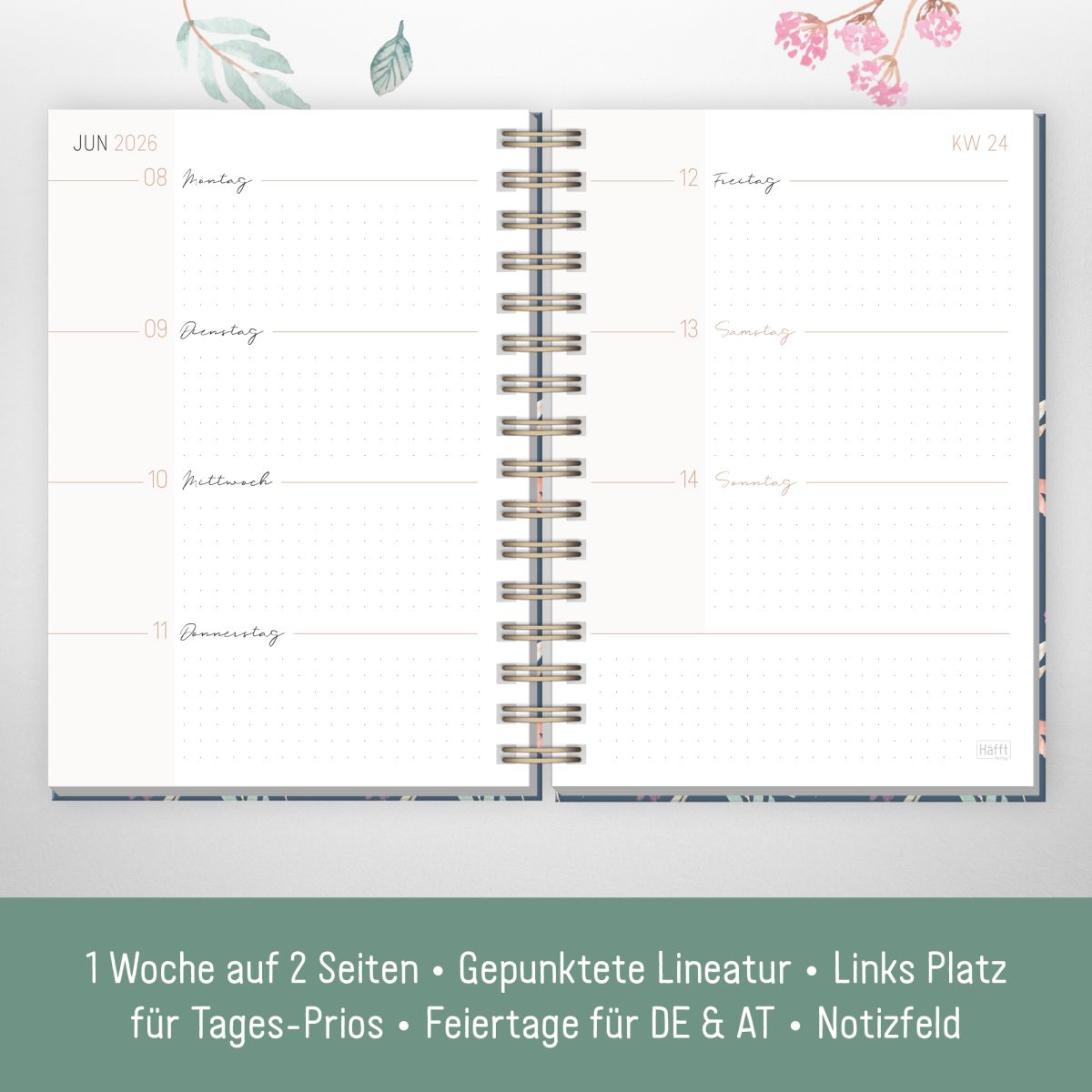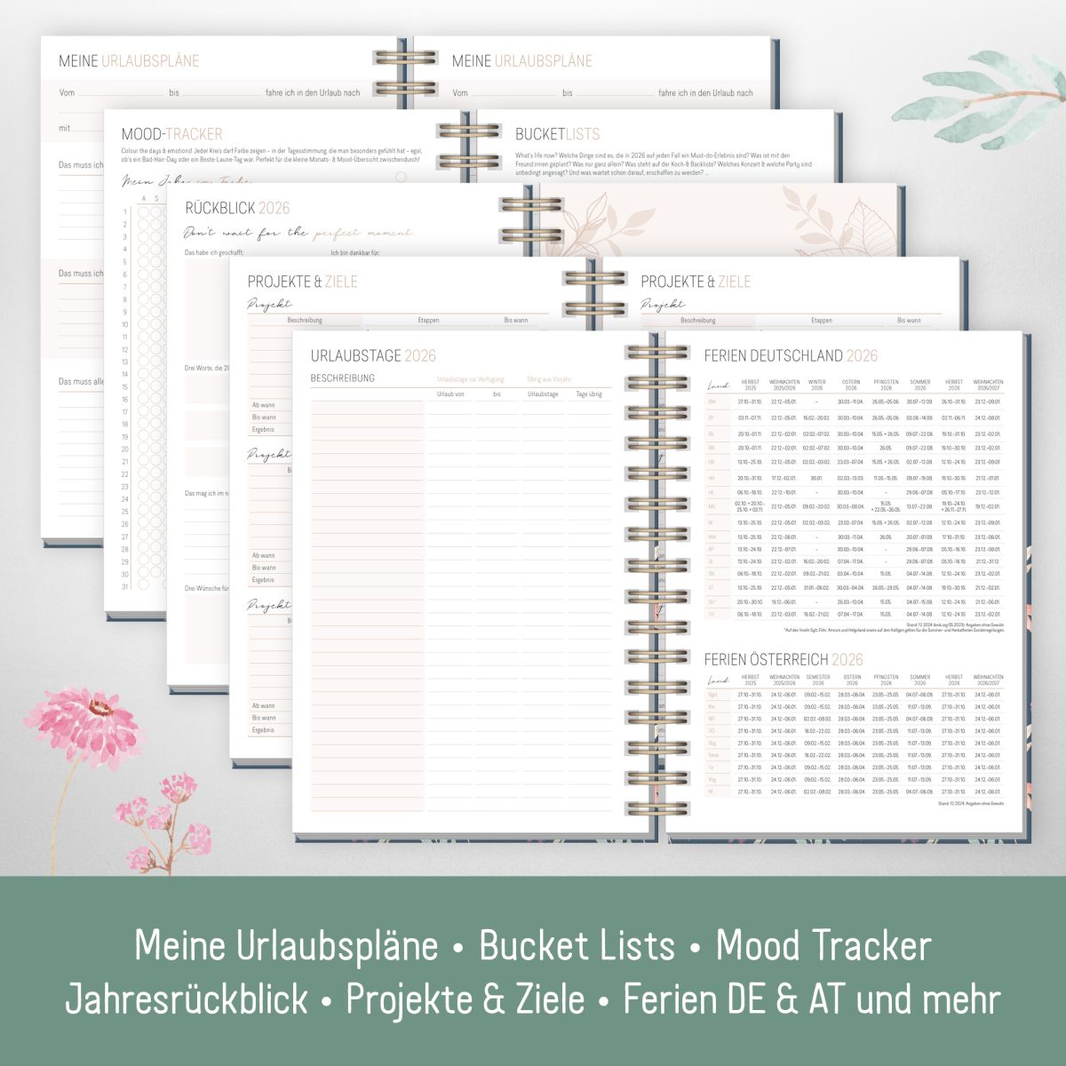 • EXTRA LIEBLINGSMOMENTE – Projekte und Persönliches im Herzensblick mit: Mood-Tracker, Bucketlist, persönlicher Rückschau auf 2026, Listen für Lebensziele, Kontakte & Urlaubspläne, Seiten für eigene Bilder & Erinnerungen zum Einkleben und dotted Notizseiten.