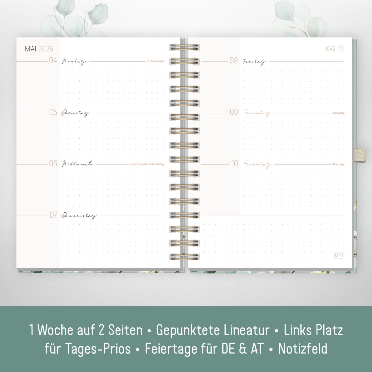 • Dein Planer für 2026 – Hardcover Wochenkalender mit Spiralbindung, 1 Woche auf 2 Seiten, inkl. Gummiband, Stifthalter, Lesezeichen, Sticker, Einstecktasche für lose Zettel und edle Cover-Prägung in gold.