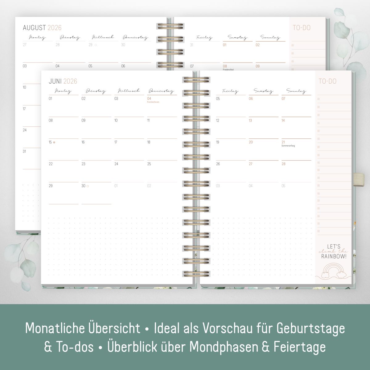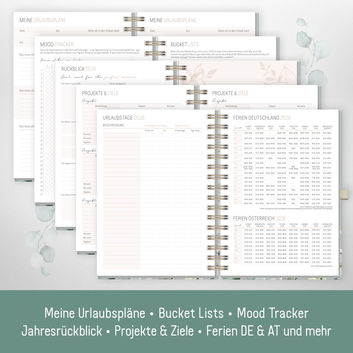 • Nützliche Features – Es erwarten dich: Notizseiten und Wochenpläne, Projekt- und Zielplaner, Finanzplaner, Bucket Lists, Mood Tracker, Kontaktlisten, Jahresübersichten, Schulferien & Feiertage, Urlaubstracker und mehr!