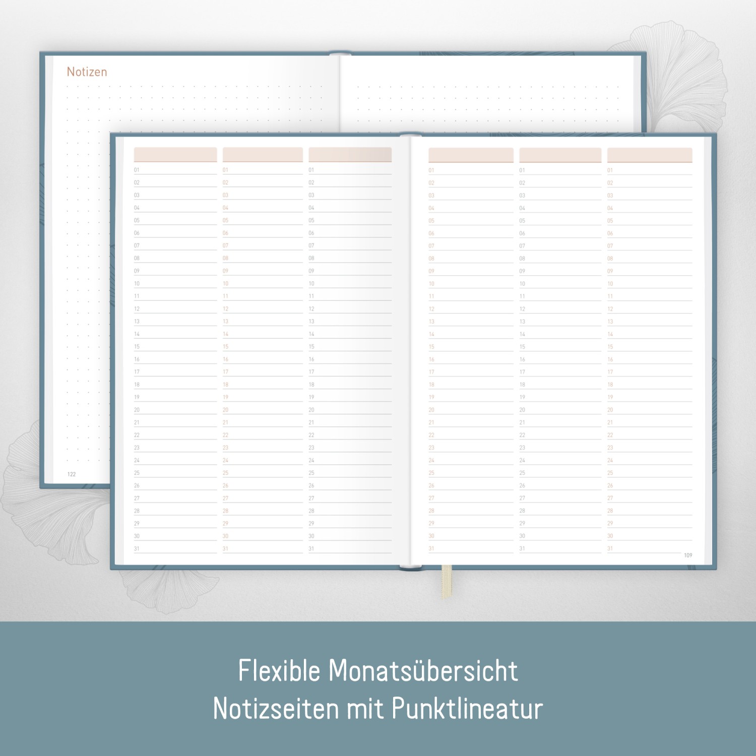 - Mehr als ein Terminplaner – Mood Tracker, Jahresrückblick, Was ich erreichen will & Das tut mir gut – Seiten, die helfen, den Alltag zu entschleunigen und die Balance zwischen Tun und Sein bewusst zu gestalten