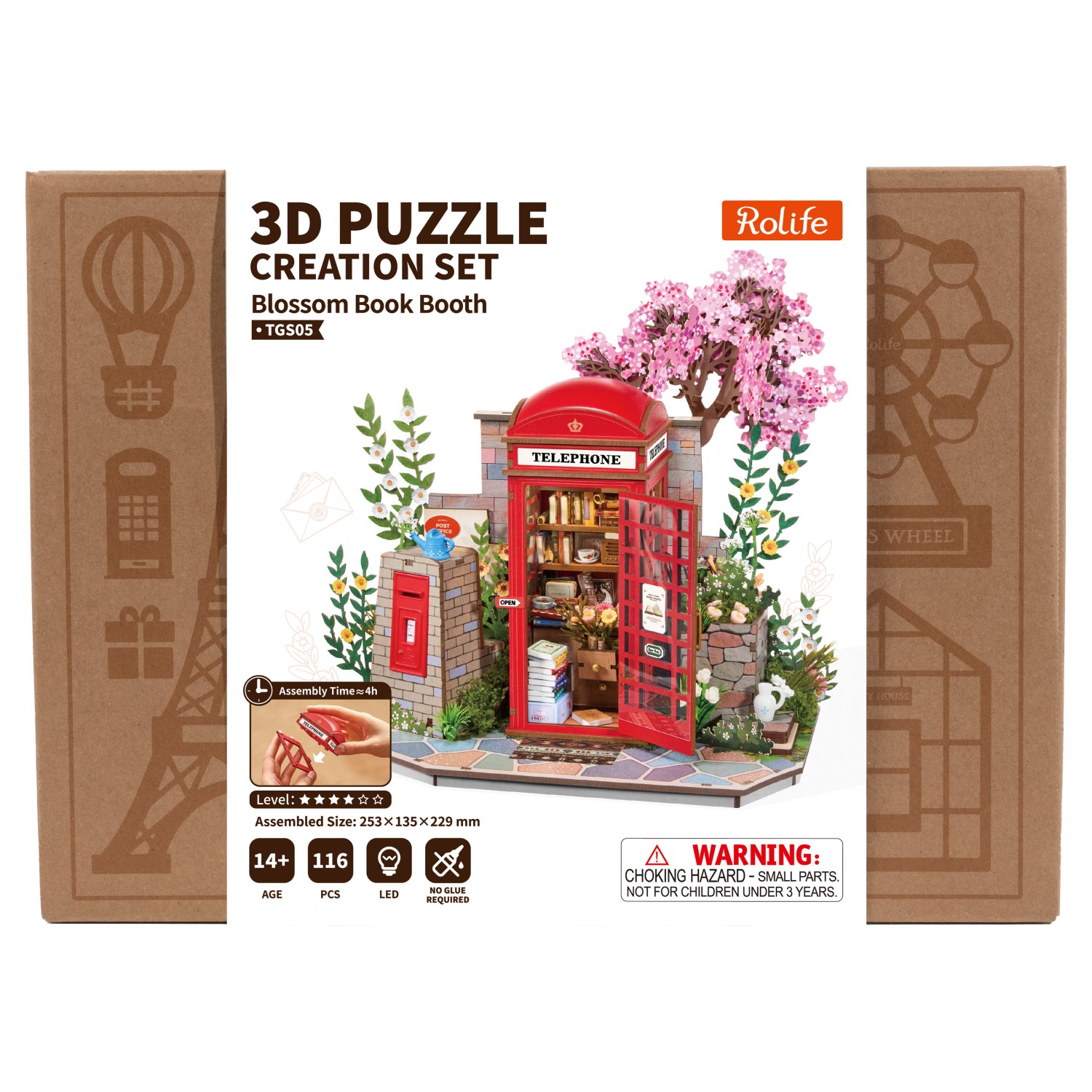Ein frisches Rolife-Puzzle mit Bücher-Telefonzelle und einem Kirschbaum während der Blüte: