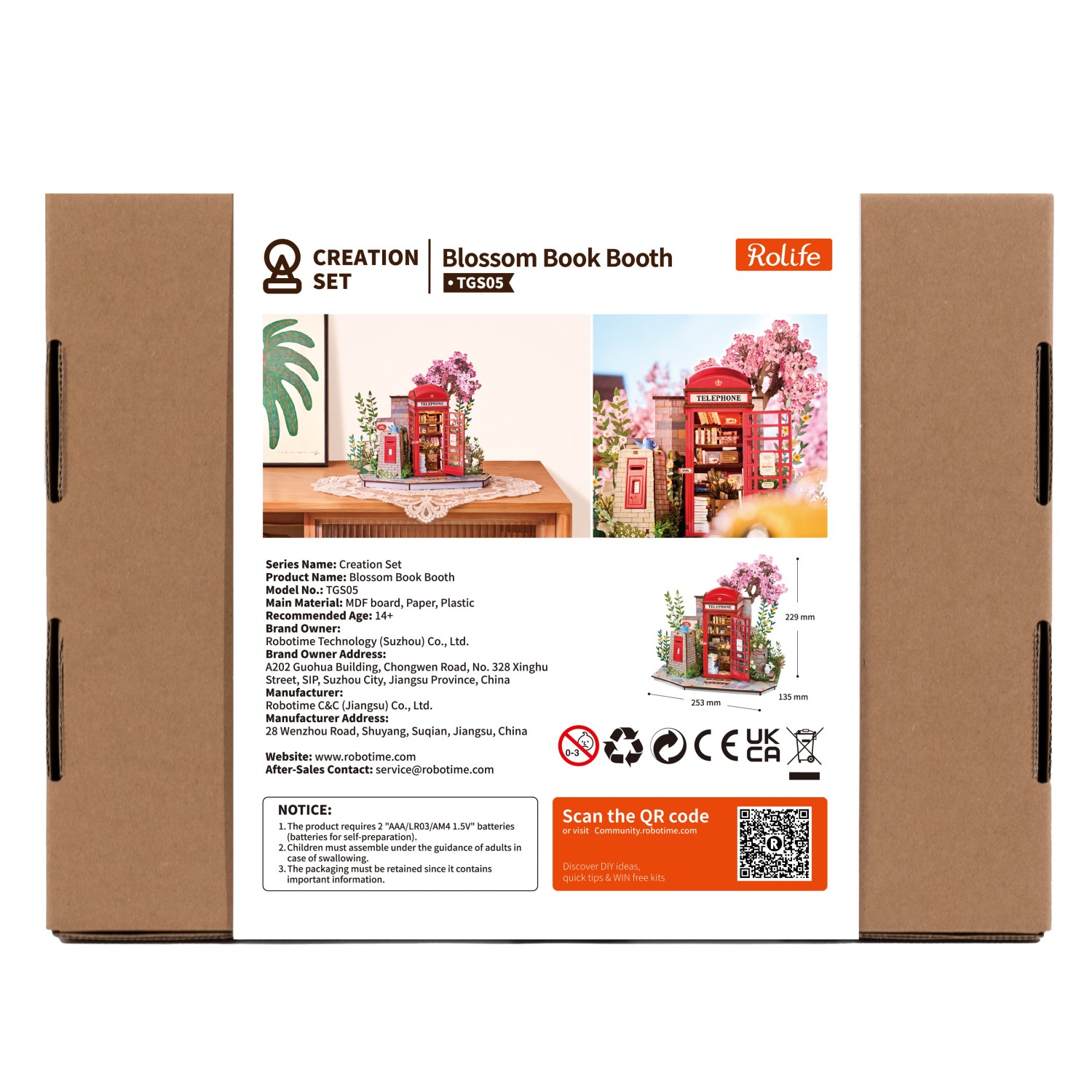 - Das Modell zeigt eine zum Buchladen umfunktionierte Telefonzelle im englischen Stil, umgeben von Blumen und einem blühenden Kirschbaum